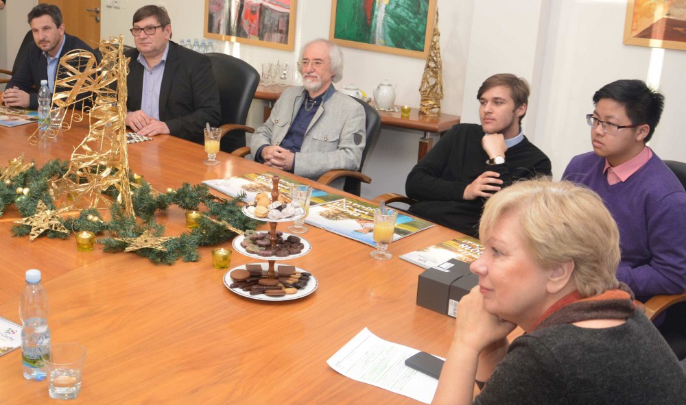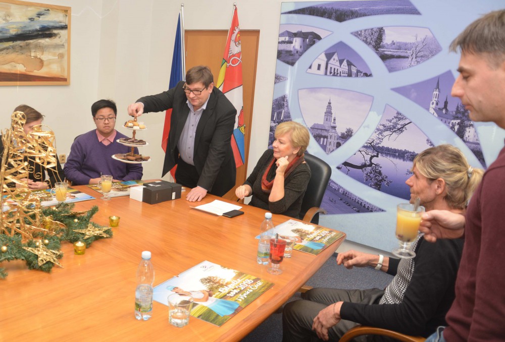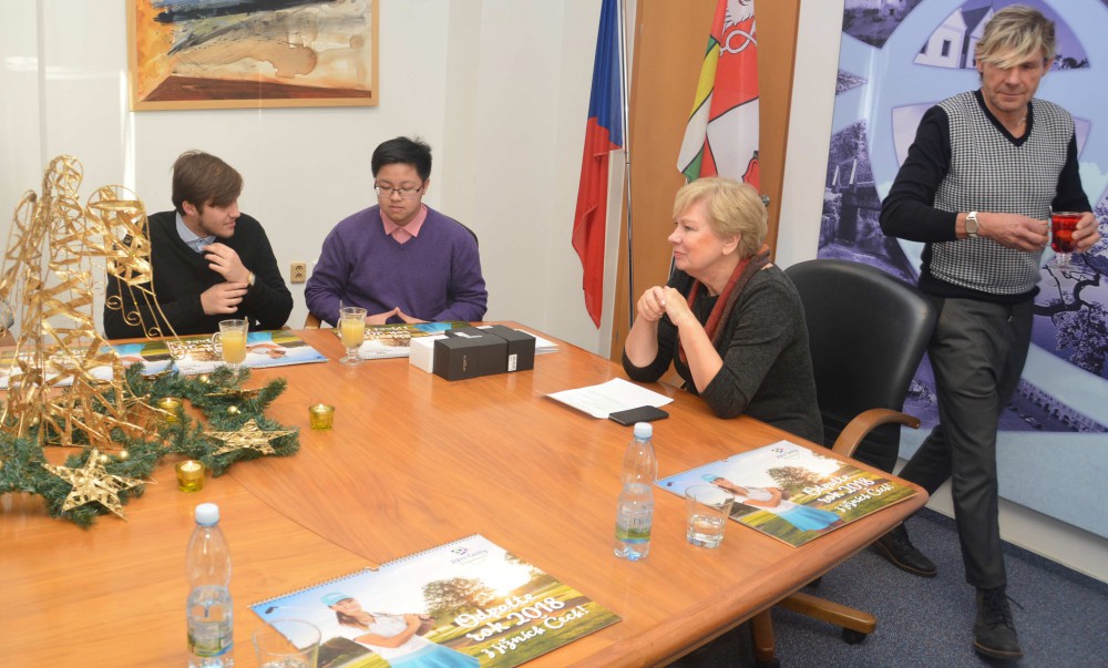 Na snímku (zprava) hejtmanka Ivana Stráská, studenti píseckého gymnázia Lam Le Sy a Martin Vokatý, ředitel píseckého gymnázia Petr Pícha, náměstek hejtmanky Pavel Hroch a její první náměstek Josef Knot.
