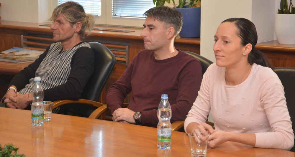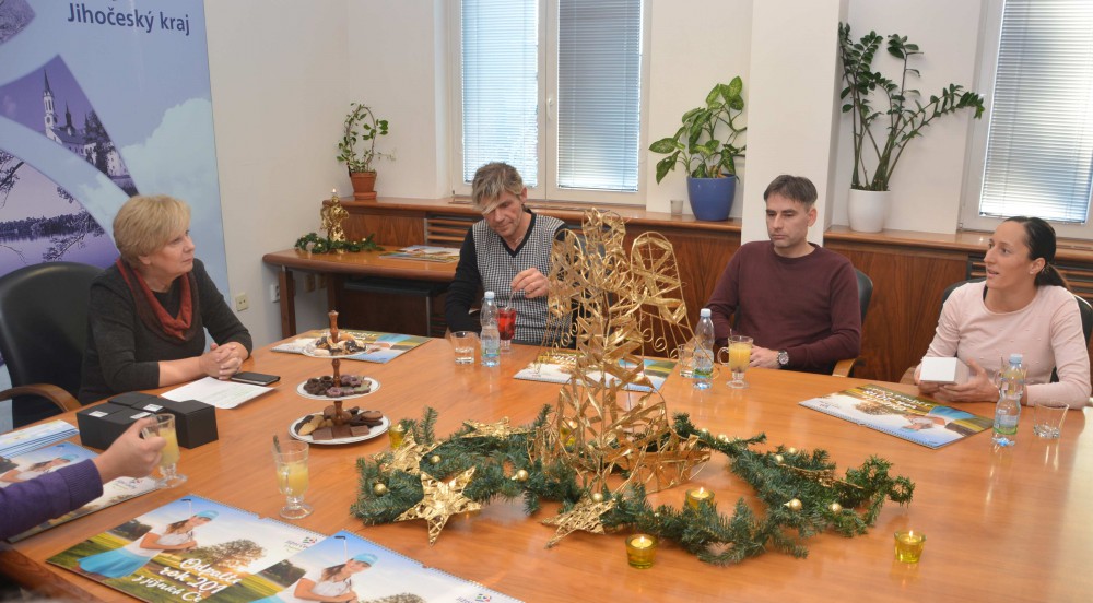 Na snímku (zleva) hejtmanka Ivana Stráská, pracovník JETE Libor Žlab, dobrovolný hasič Vlastimil Hembera a trenérka sportovní přípravky TJ Karate České Budějovice Dominika Hýsková.