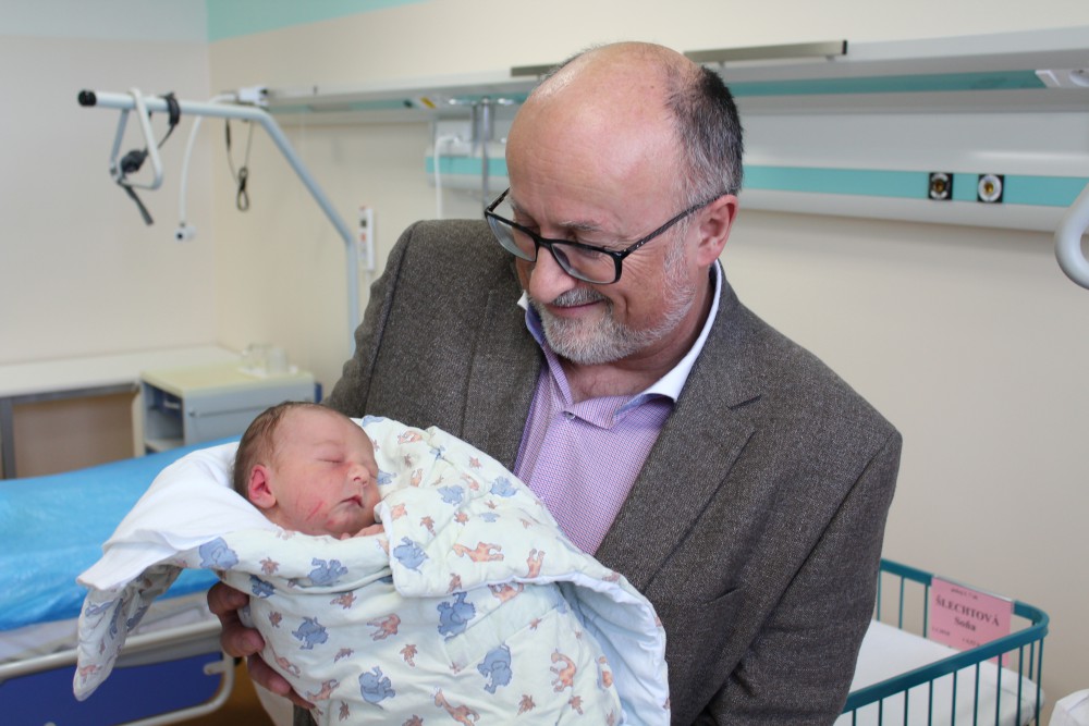 Primátor Jiří Svoboda  dnes v českobudějovické porodnici pozdravil maminku prvního miminka narozeného 1.1.2018.