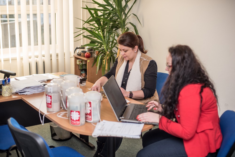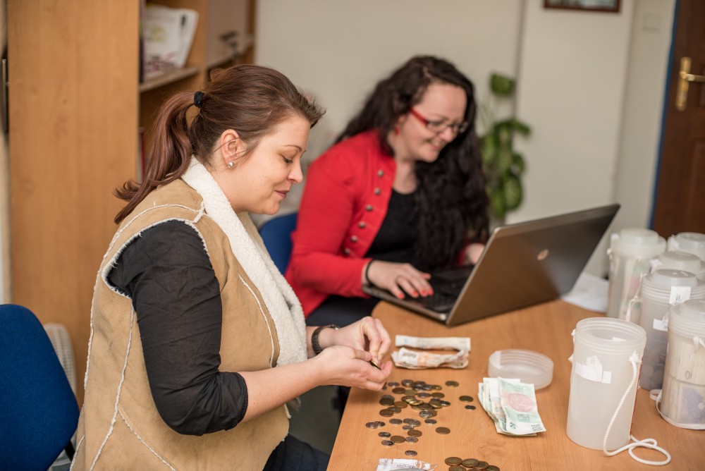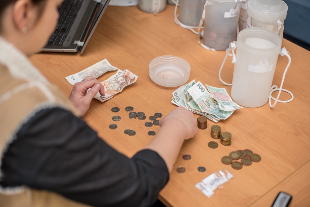 Počítání příspěvků na Tříkrálovou sbírku v Městské charitě České Budějovice.