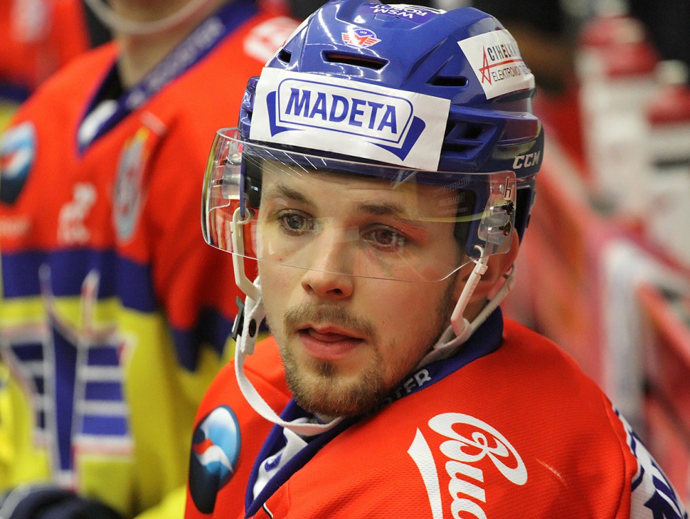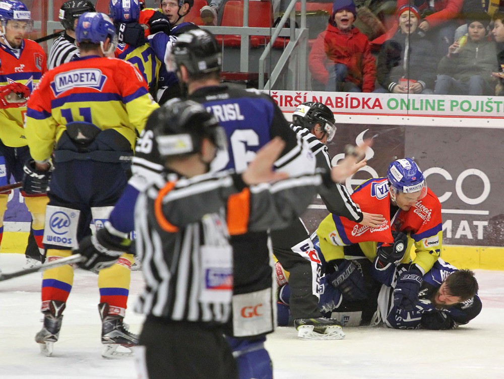 Domácí útočník Miloslav Čermák dotírá na hostujícího gólmana Martina Růžičku. Ten má však kotouč ve své moci