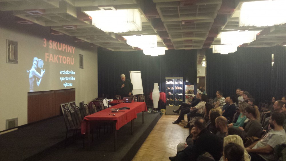 Na přednášce vystupuje hlavní trenér A-týmu Marian Jelínek