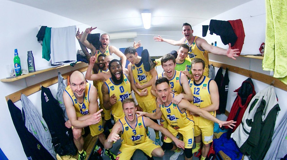 Oslava jindřichohradeckých basketbalistů po první letošní výhře