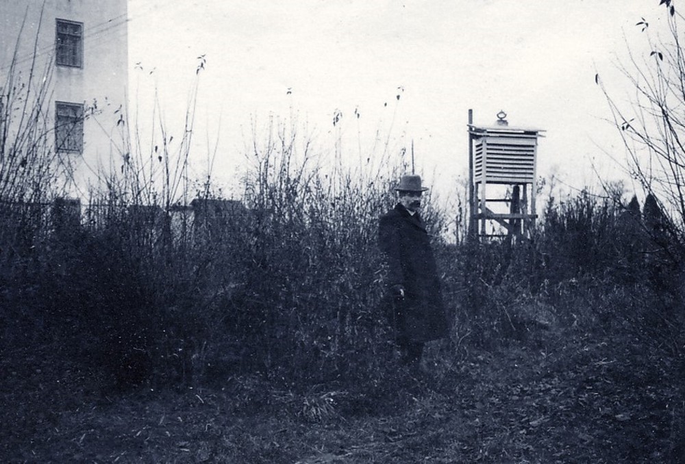 Profesor Jaroslav Maňák u meteorologické stanice ve Stecherově mlýne v roce 1932