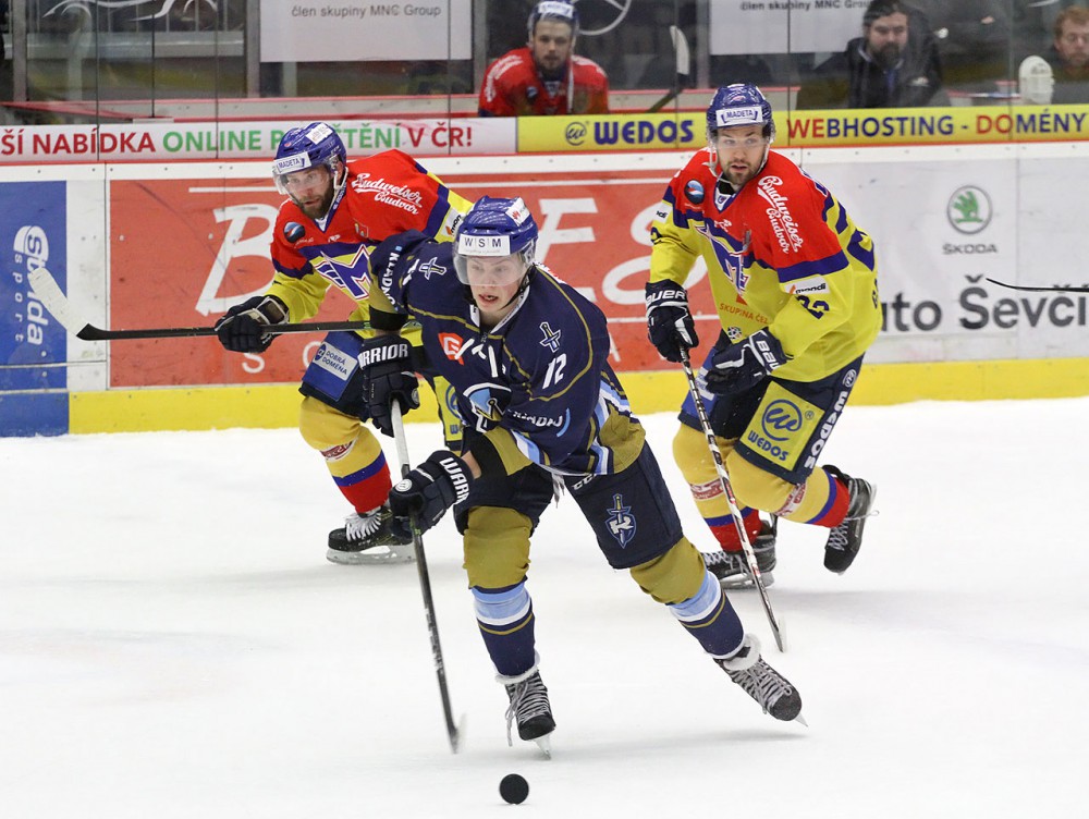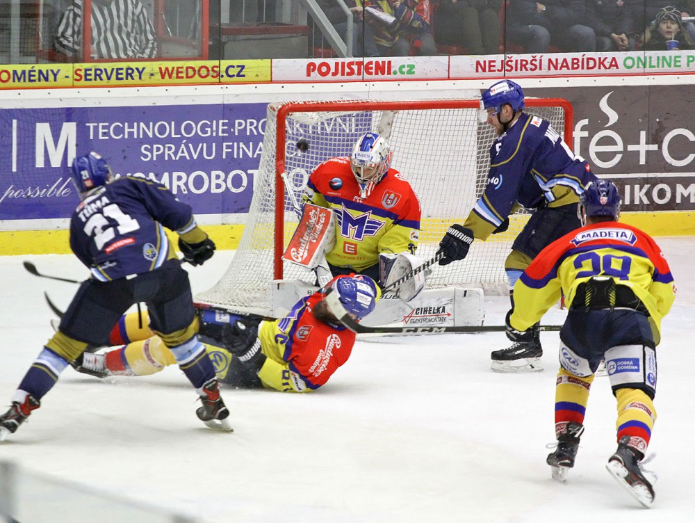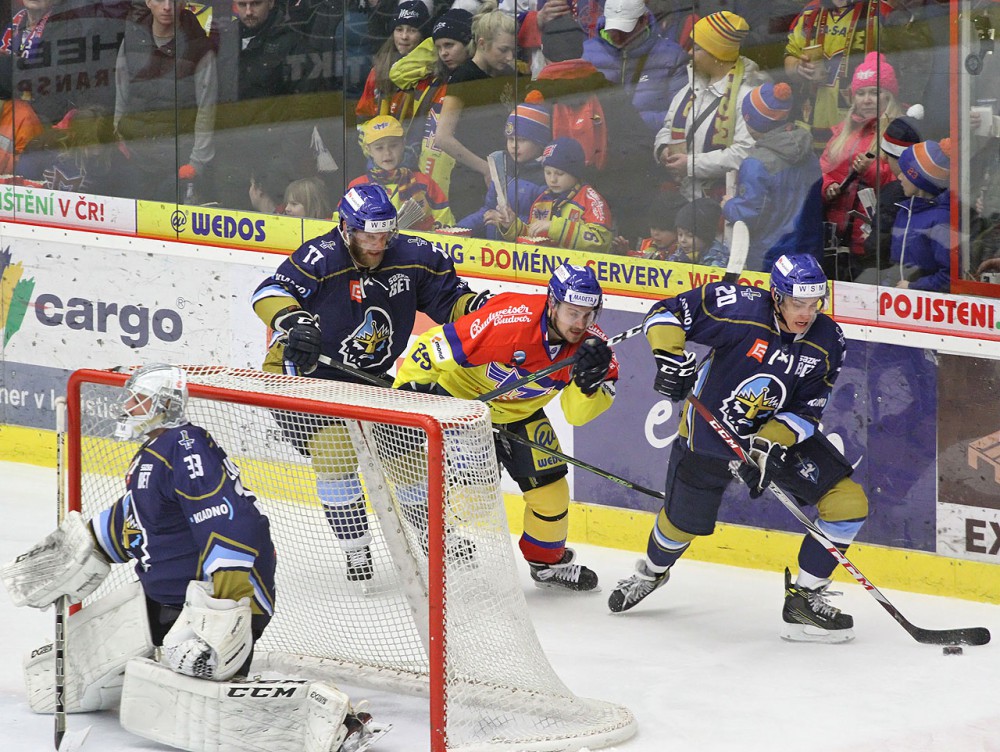 Hvězda utkání David Tůma (uprostřed čeká na dorážku před Kváčou). Kapitán Rytířů Kladno dal proti Motoru hattrick