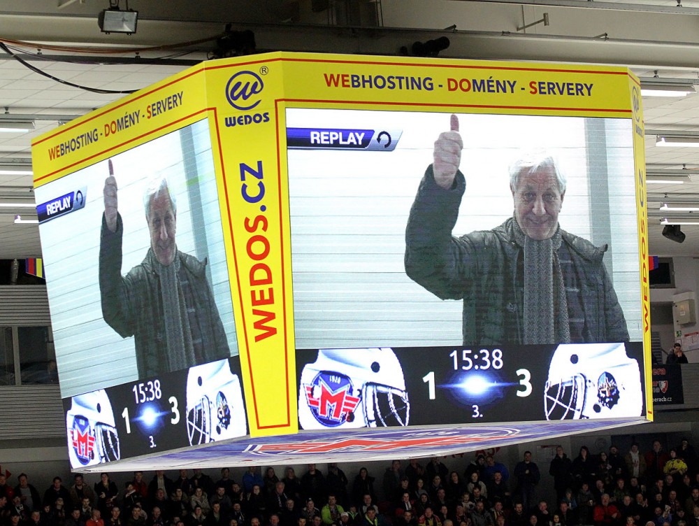 Josef Mikyska bojuje za kladenskou brankou proti hostující přesile. U kotouče Roman Přikryl, vlevo David Štich