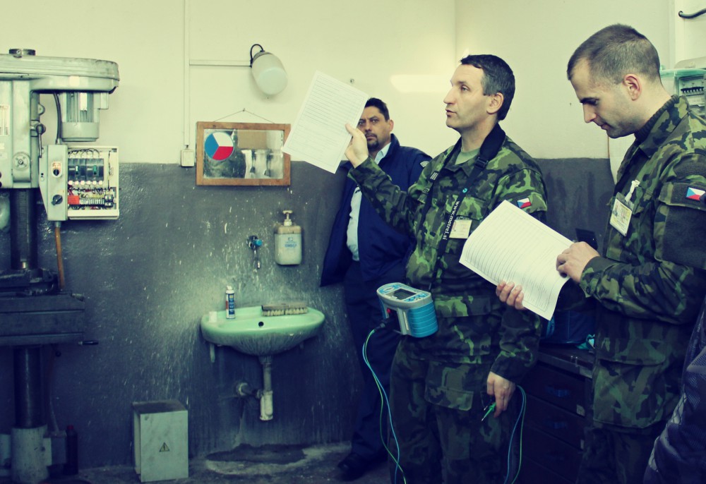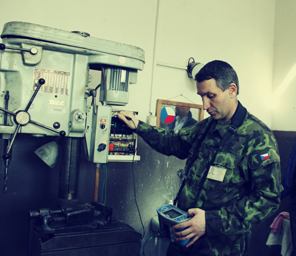 Praporčík Václav Kučera názorně předvedl, jak probíhá kontrola izolačního stavu pracovního stroje.