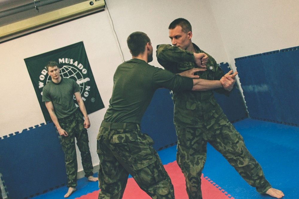 Jeden z instruktorů Lukáš Kovanda předvádí vojákům sebeobrannou techniku.