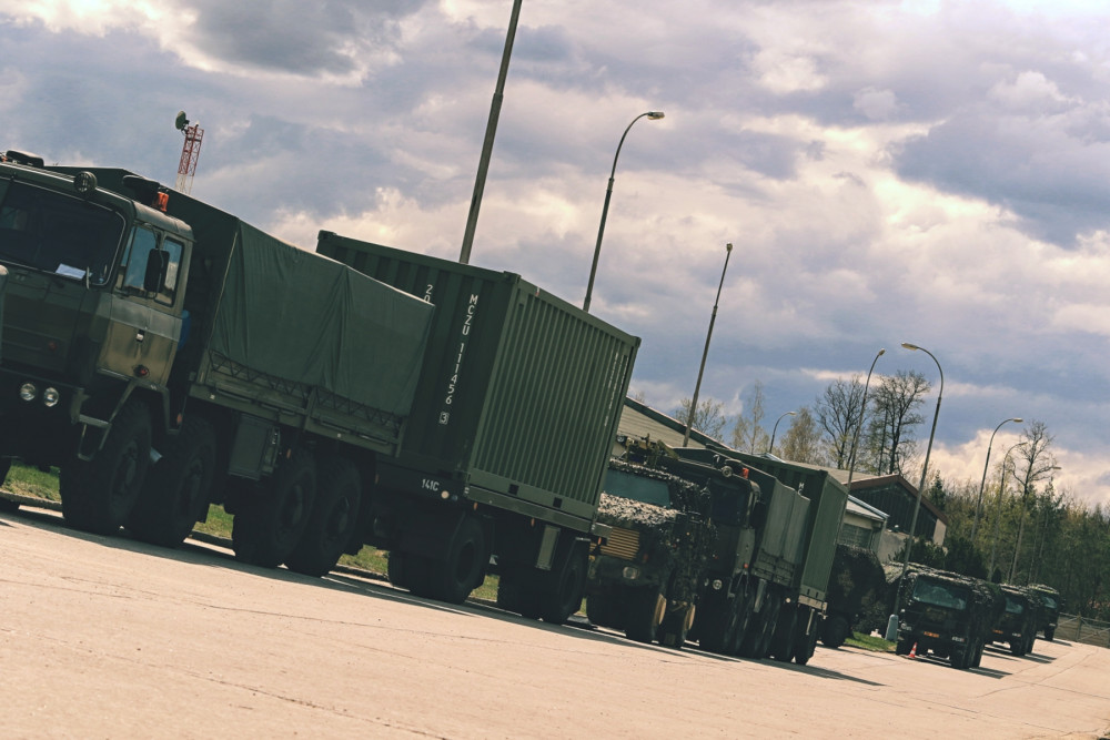 Kolona vojenských vozidel je připravena k odjezdu na cvičení.