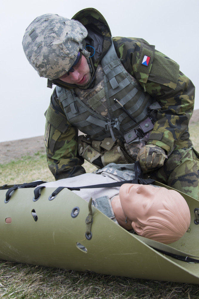 Po poskytnutí první pomoci museli soutěžící zkompletovat radiostanici a vyžádat letecký transport raněného – MEDEVAC.