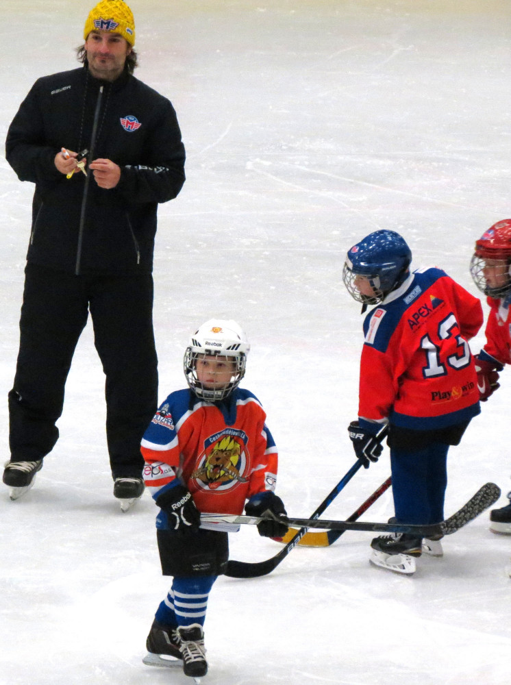 Václav Král jako rozhodčí při zápase HC Motor a HC Českobudějovičtí lvi, souboji hokejových nadějí narozených v roce 2011 (Foto: Patrik Krejčí).