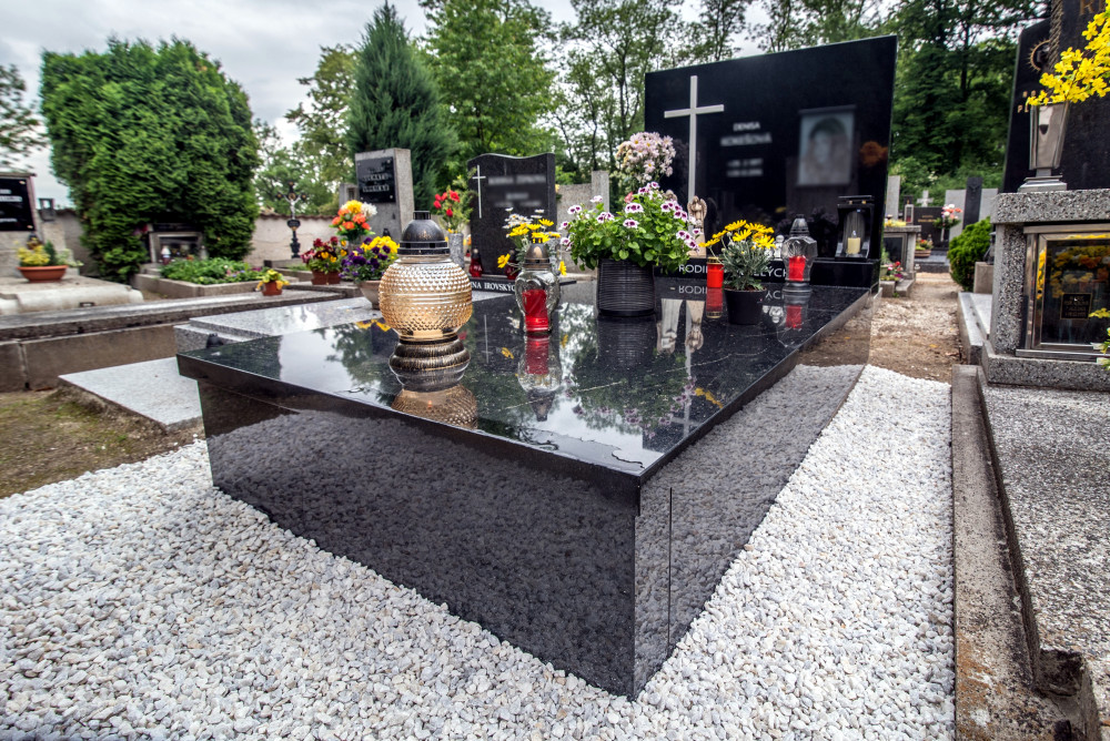 Atypický jednohrob z černé žuly, na jehož náhrobku je LED diodami podsvícený portrét.