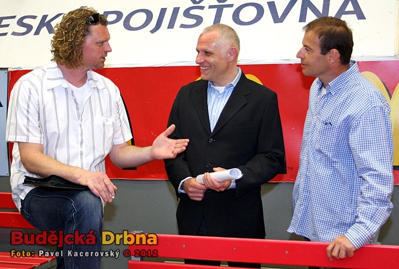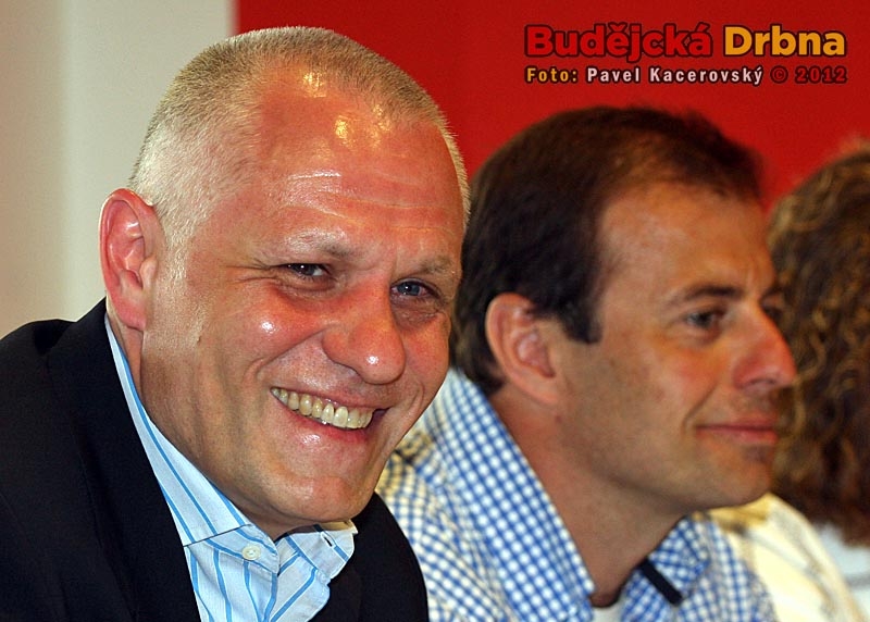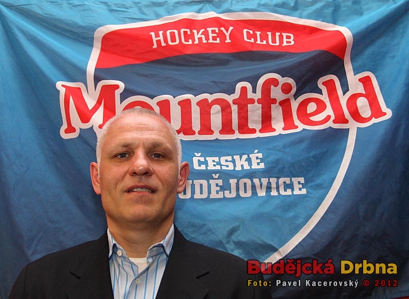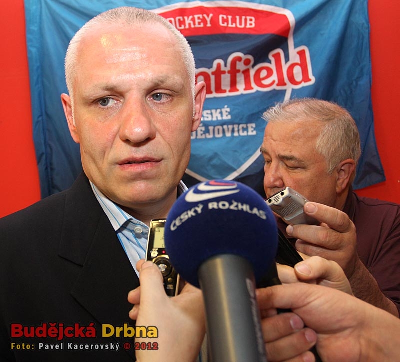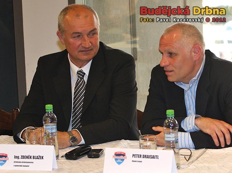 Předseda představenstva a sportovní manažer HC Mountfield Zdeněk Blažek s novým hlavním koučem Mountfieldu Peterem Draisaitlem