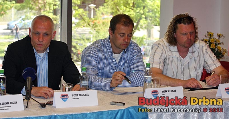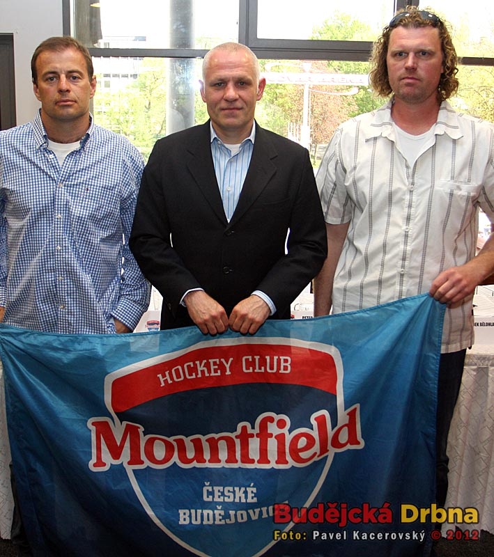 HC Mountfield představil nové trenérské trio - Petera Draisaitla (uprostřed), Radka Bělohlava a Romana Turka (vpravo)