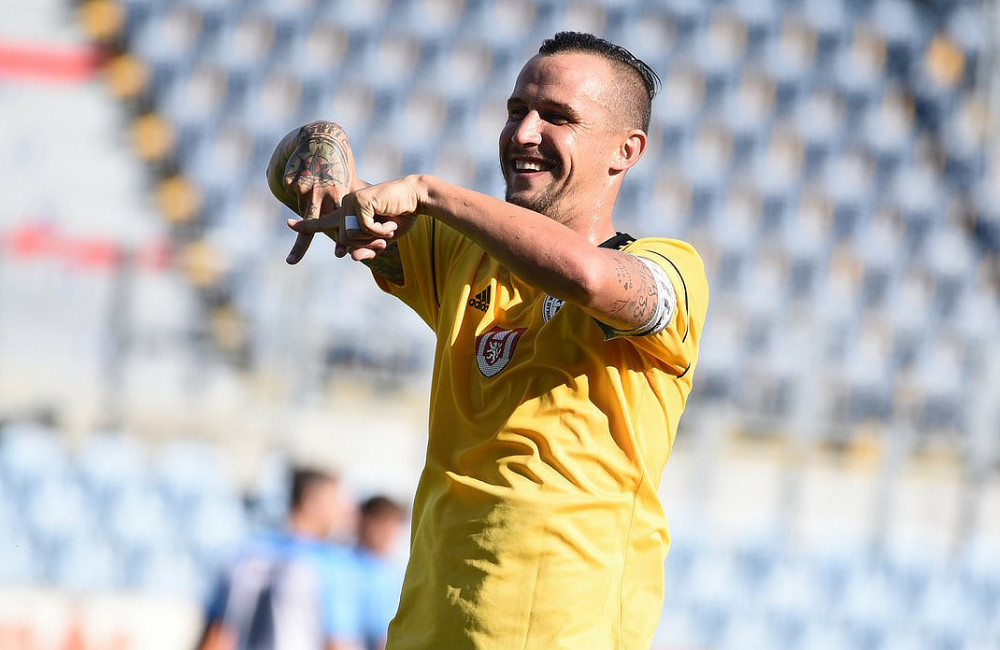 Áčko, které českobudějovický fotbalista Jiří Kladrubský signalizuje na úvodní fotce, značí asistenci u první trefy Davida Ledeckého v utkání čtvrtého kola Fortuna: Národní ligy s Prostějovem.