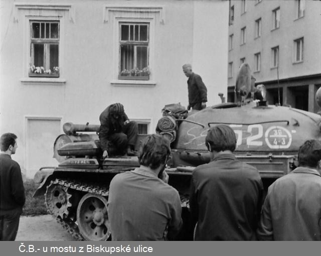Ruský tank před mostem u armáďáku v obležení našich lidí. Někdo se snažil diskutovat, ale bylo to marné, tank jen občas zahýbal hlavní. Archiv:Jan Schinko. Foto: Bohumil Štěpánek