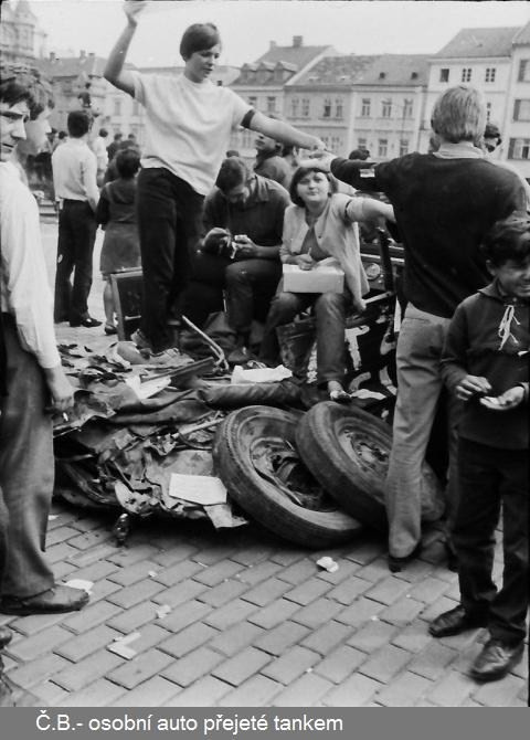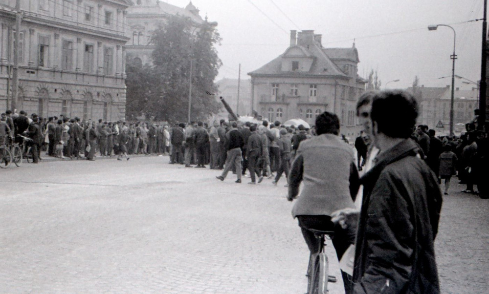 Bohumil Štěpánek zachytil před spořitelnou dva ruské tanky. Archiv Jan Schinko; Foto: Bohumil Štěpánek