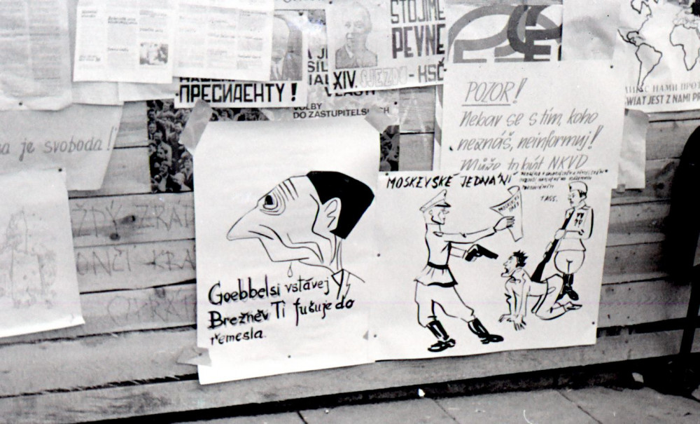 Stavební ohrada na náměstí poblíž nároží ulice Stejskalovy posloužila k informacím a k protiokupačním výtvarným dílů. Archiv Jan Schinko; Foto Bohumil Štěpánek