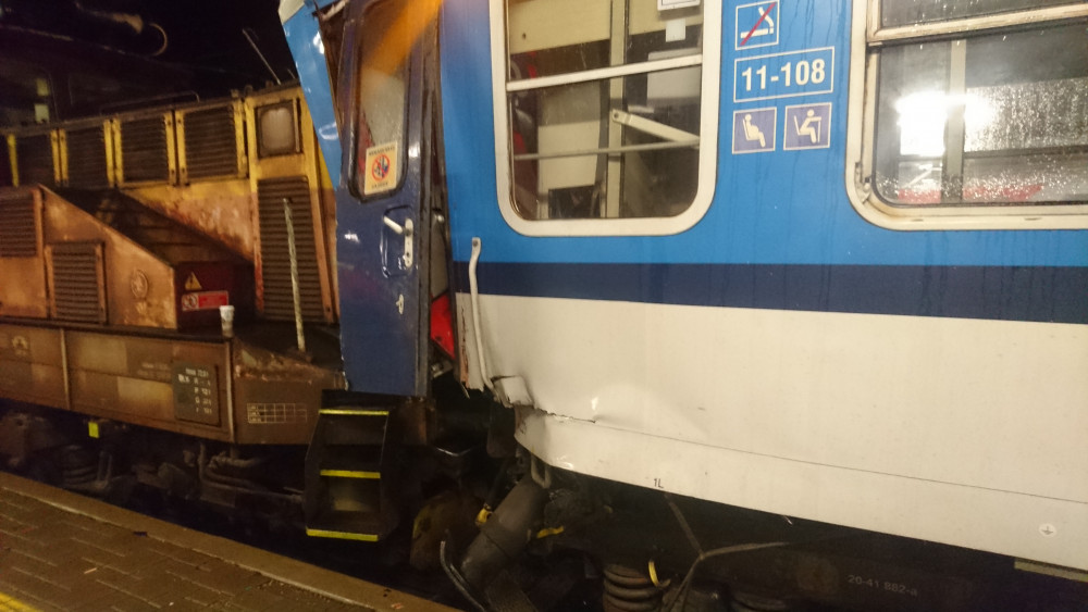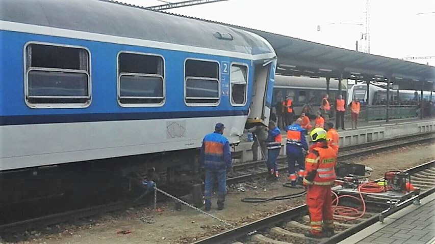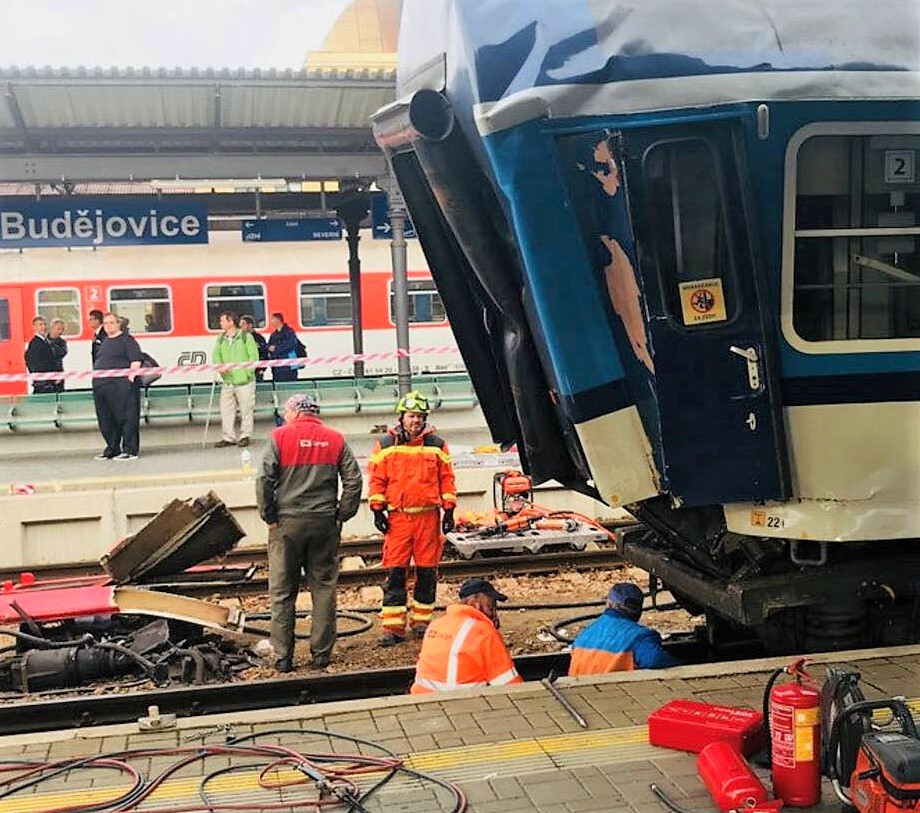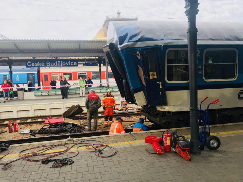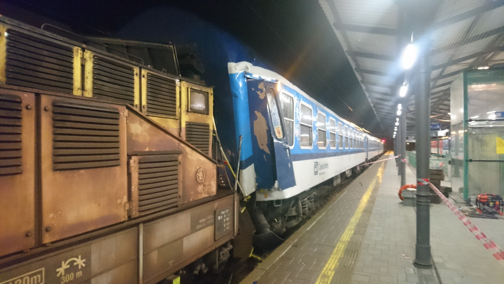 VIDEO: Na budějckém nádraží se předvečer Národního dne železnice srazila lokomotiva s vagony. Tři lidé se zranili