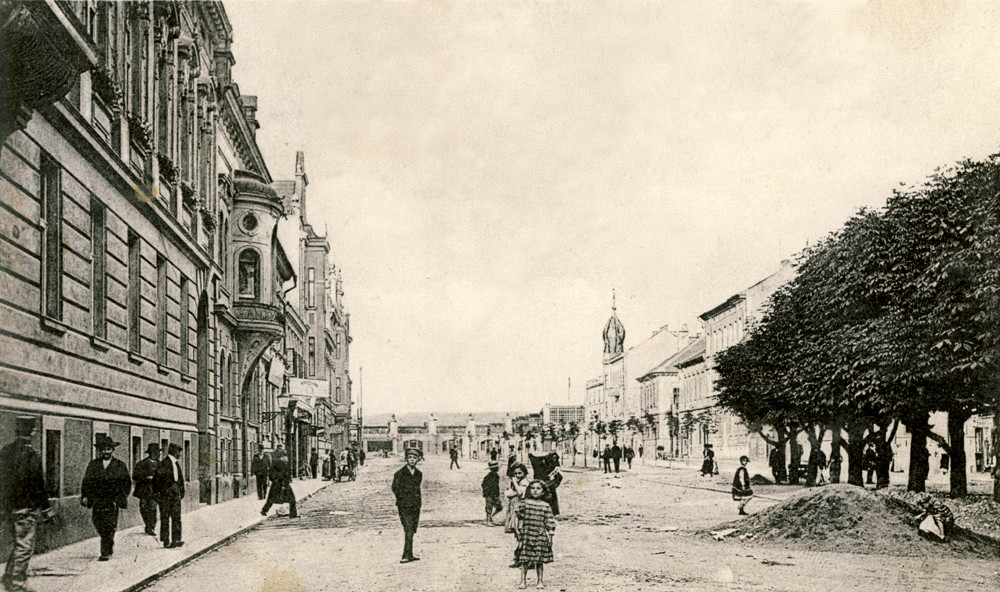 Lannovka v záběru od Štítného ulice k nádraží, vlevo Gellertův dům.