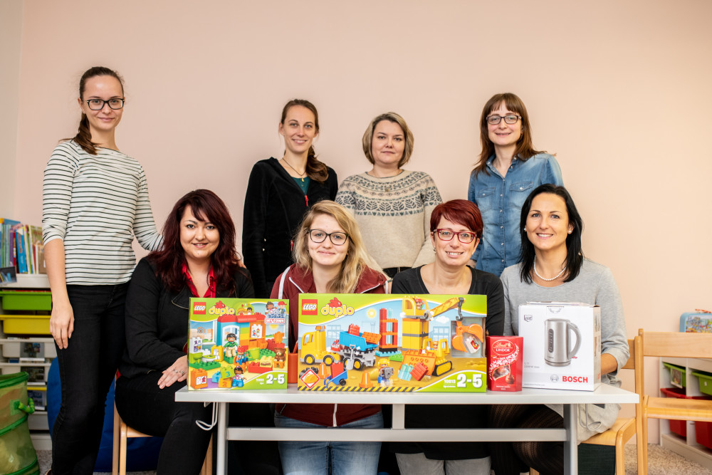 Zaměstnanci Auticentra s dárky od Františka Gaiera z Autodoprava Gaier.