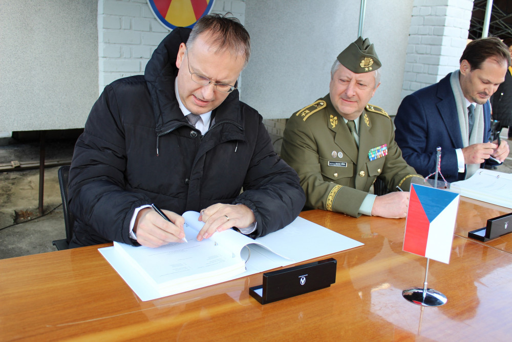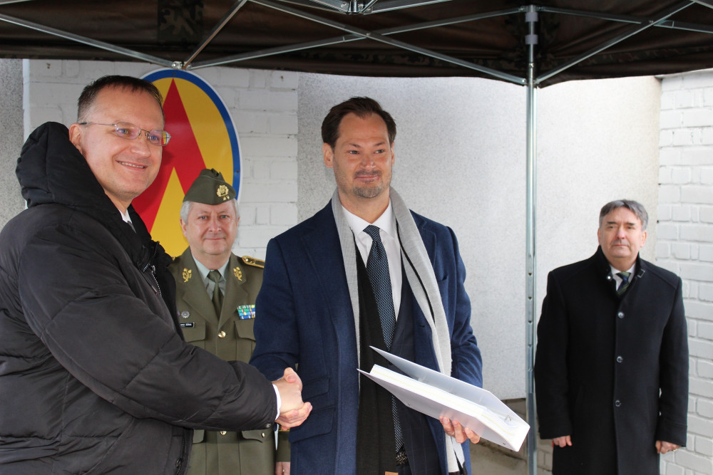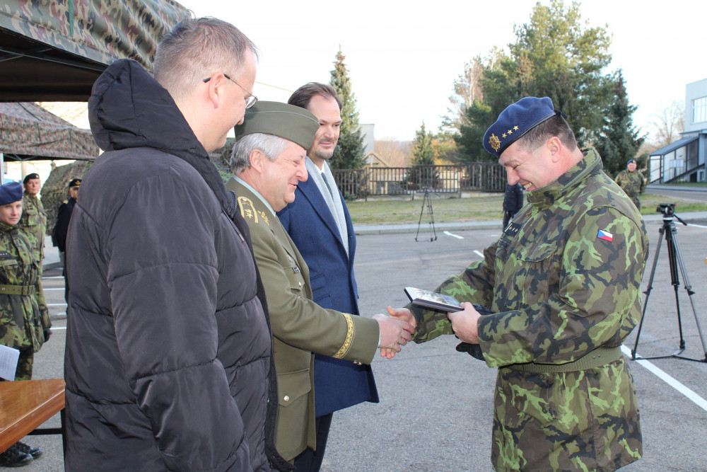 Velitel strakonického útvaru plukovník Ján Sedliačik předal během slavnostního nástupu plakety, které budou hostům připomínat podpis smlouvy.