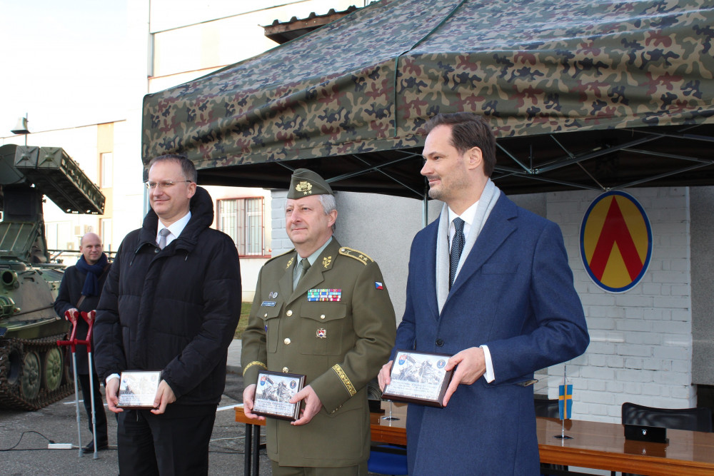 Náměstek Daniel Koštoval, generálmajor Jaromír Zůna a Kristian Wallin (zleva) obdrželi pamětní plakety.
