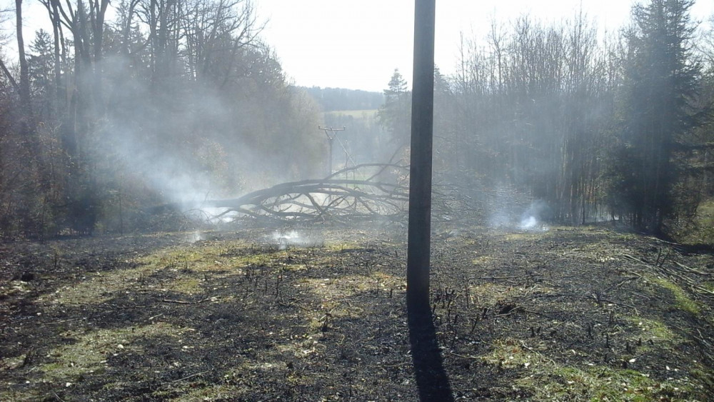 Pád dubů na elektrické vedení zapálil dva tisíce metrů čtverečních trávy