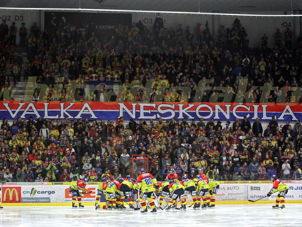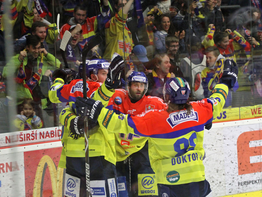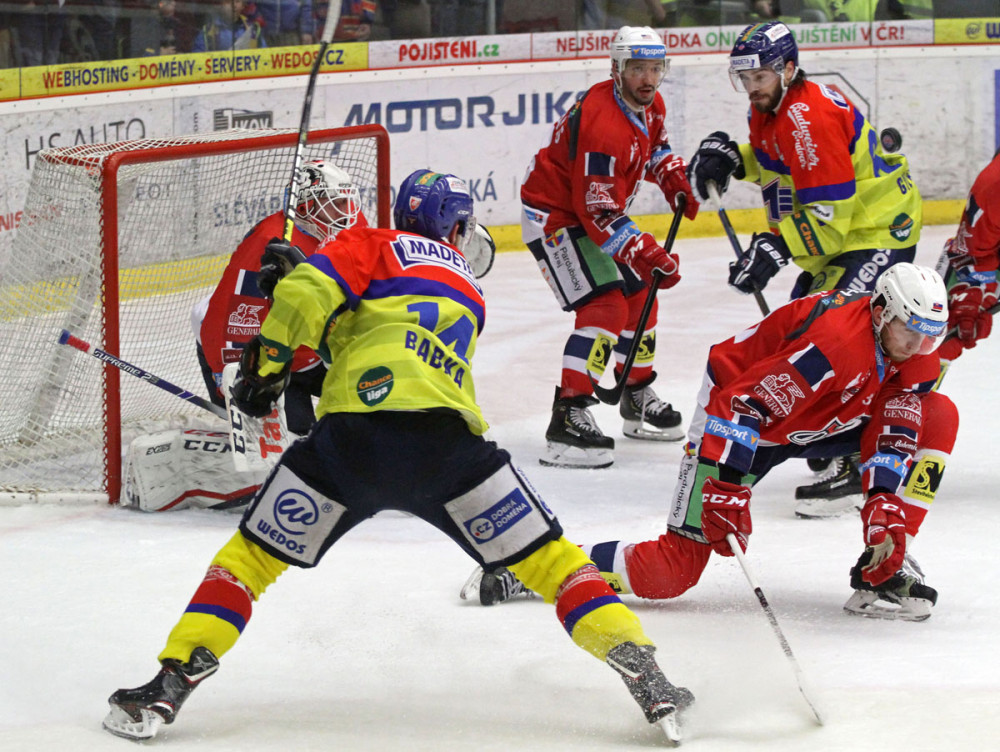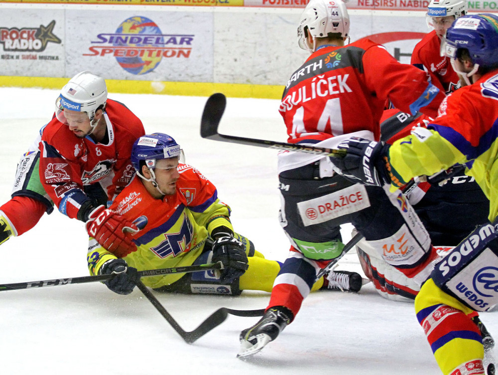 Nicholas Schaus srazil na led před vlastní brankou střelce prvního domácího gólu Zdeňka Doležala