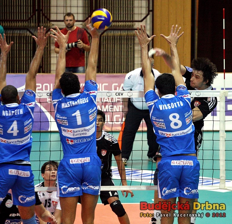 Budějcká Sportovní hala zase uvidí zápasy volejbalové Ligy mistrů. Na snímku Tomáš Fila proti bloku italského Cunea