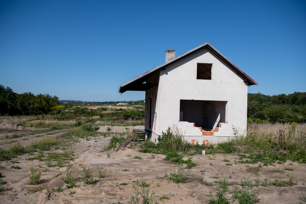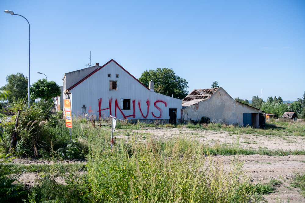 Domy na Srubci, které čeká kvůli stavbě dálnice demolice, někdo popsal nápisem "hnus".