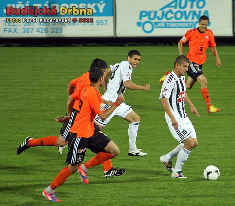 Momentka ze zápasu s Olomoucí. Filip Rýdel u míče, za ním běží autor dvou gólů do boleslavské sítě Miroslav Marković