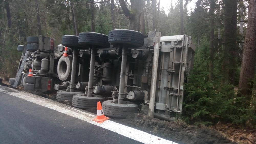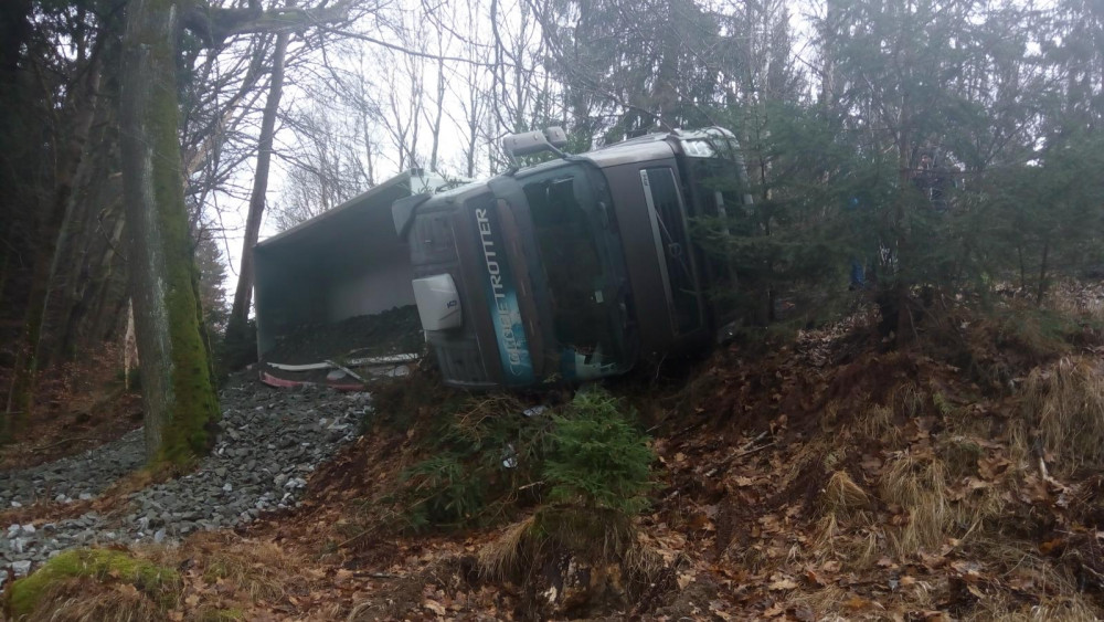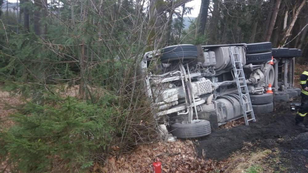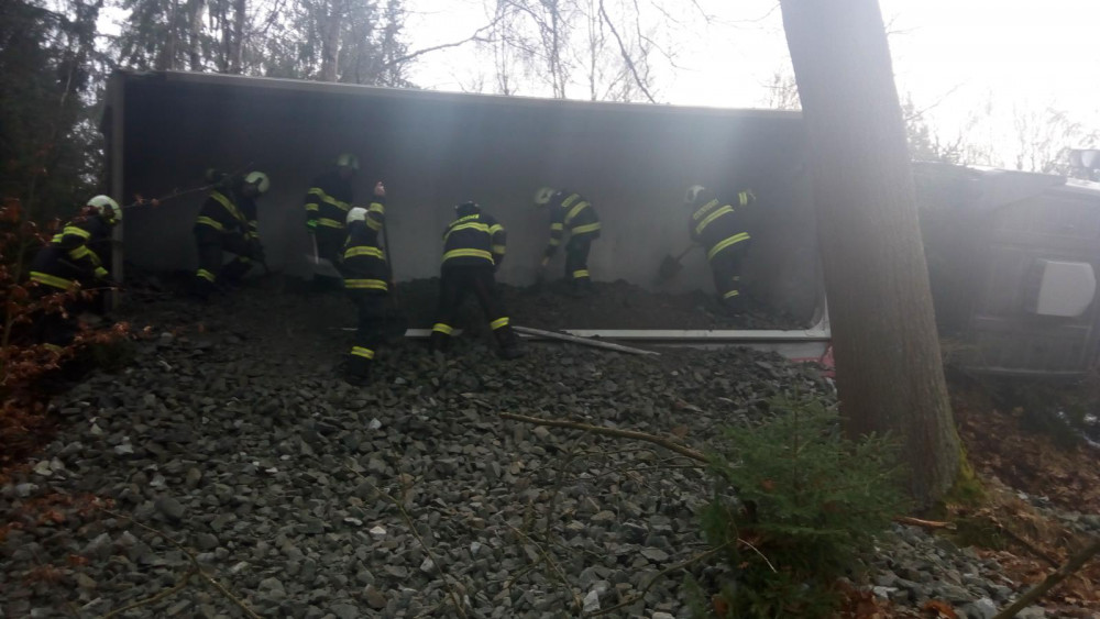 Při nehodě kamionu se vysypalo šest tun štěrku, hasiči na místě pracovali čtyři hodiny