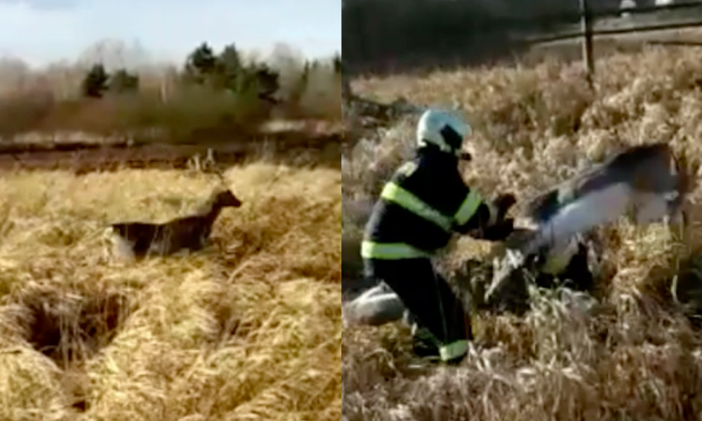 VIDEO: Hasiči zachraňovali v Haklových Dvorech jelena. Parožím se zasekl do mrtvého soka