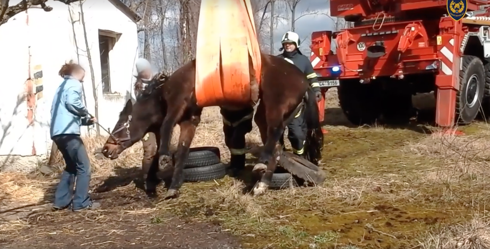 VIDEO: Postavit kobylu na nohy musel jeřáb, při zásahu asistovali hasiči z Budějc