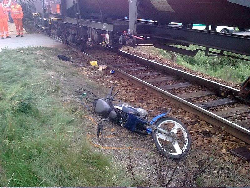 Motocykl ženy, která vjela pod vlak