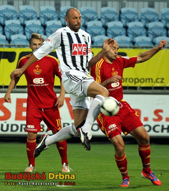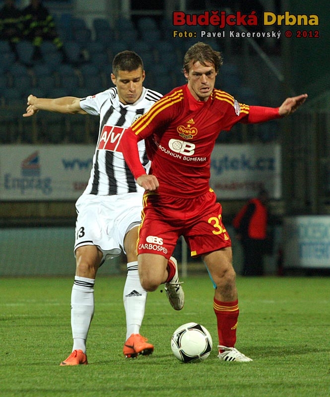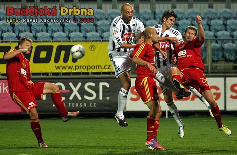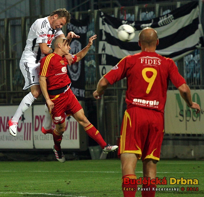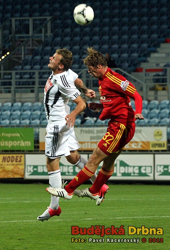 Poprvé v této sezoně skóroval proti Dukle Praha útočník Jakub Řezníček (na snímku hlavičkuje s Tomášem Borkem)