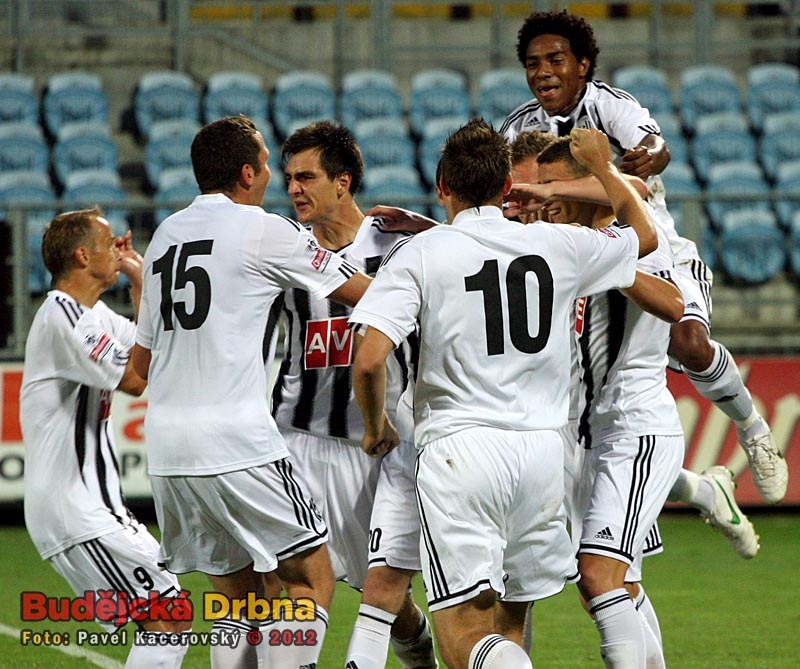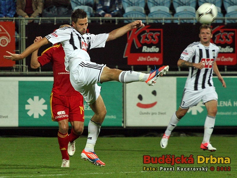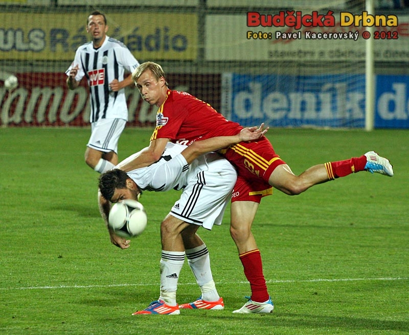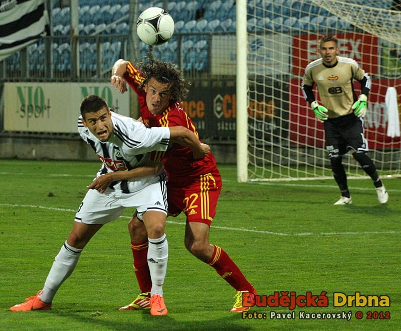Poprvé v této sezoně skóroval proti Dukle Praha útočník Jakub Řezníček (na snímku hlavičkuje s Tomášem Borkem)