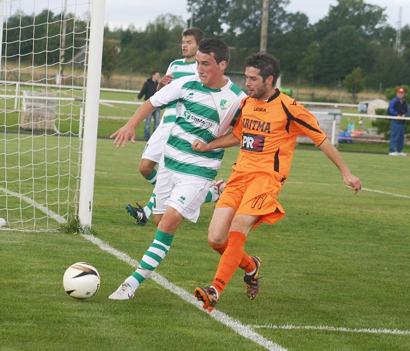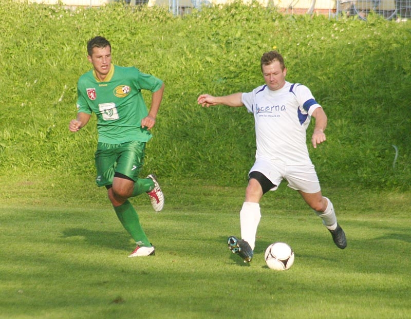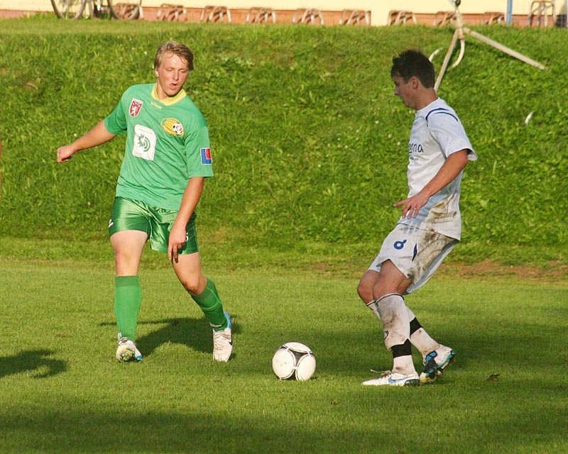 Střídající Daniel Lerch z Roudného (v zelenobílém) pouští míč do autu před dotírajícím Michalem Pánkem