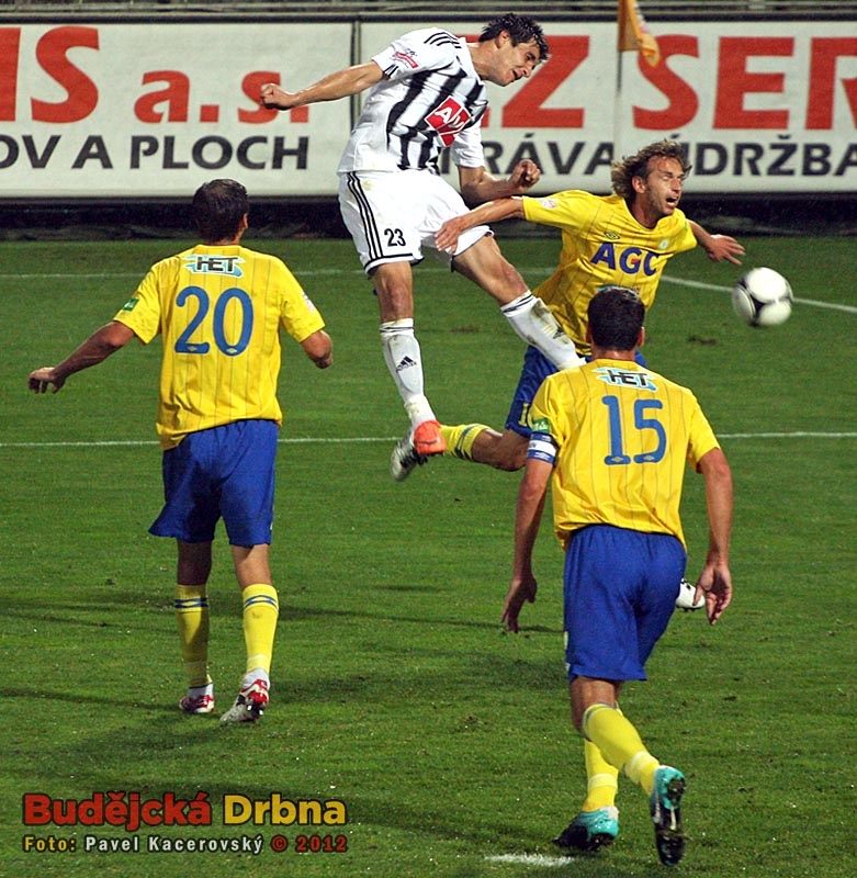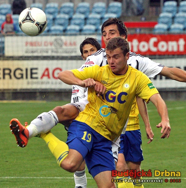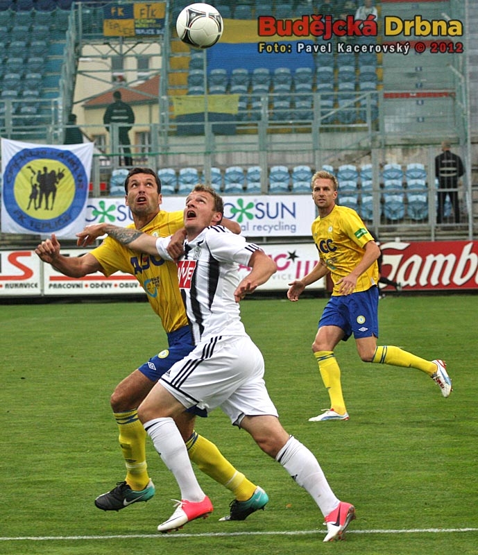 Stoperská dvojice Dynama Roman Lengyel (ve výskoku) a Tomáš Řepka (vzadu) dokázala teplického střelce Aidina Mahmutoviče ubránit