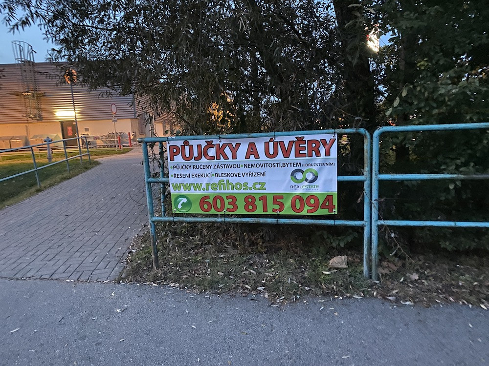 Nelegální reklama v centru města nabízí půjčky a úvěry. Firma o plachtách neví