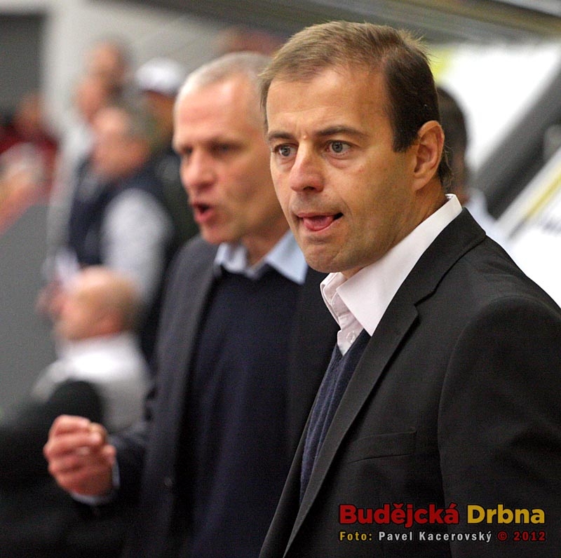 Trenérská dvojice Mountfieldu - Radek Bělohlav a Peter Draisaitl (v pozadí)