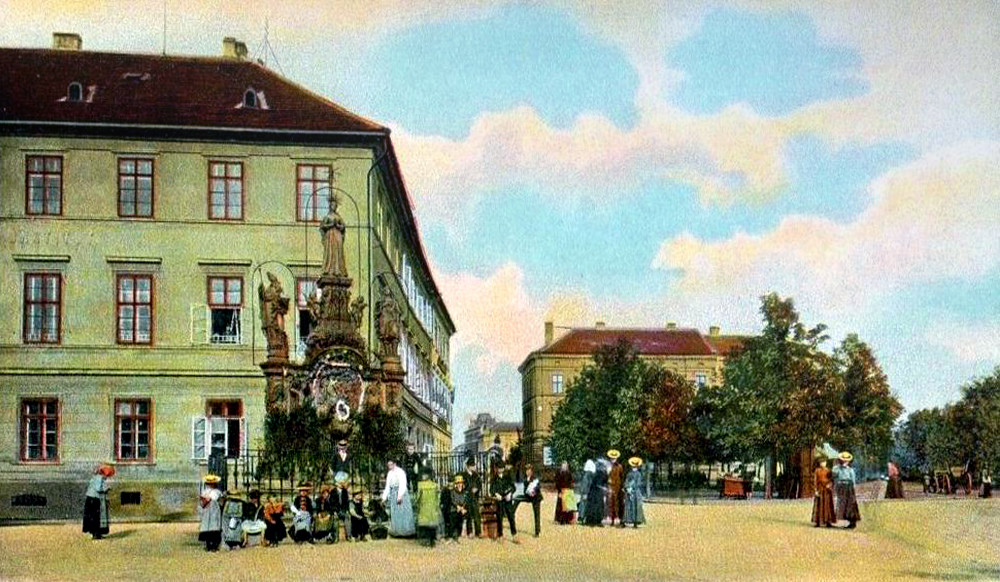 Mariánské sousoší na Mariánském náměstí, v pozadí Lobkovické náměstí za c. k.