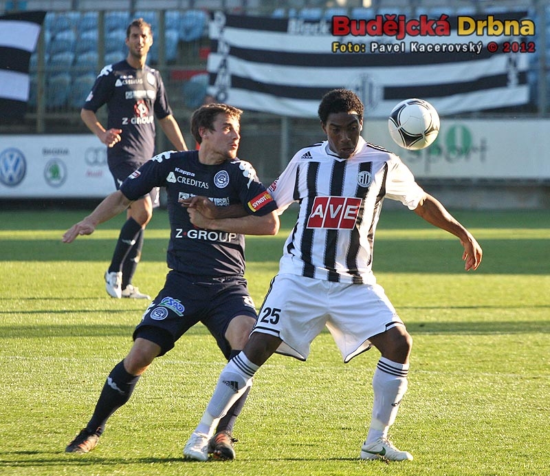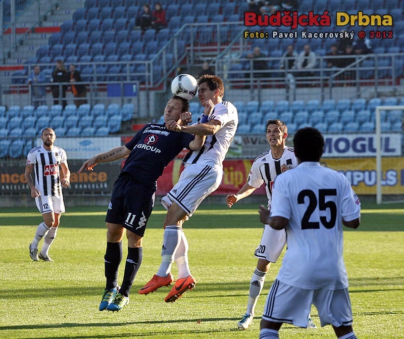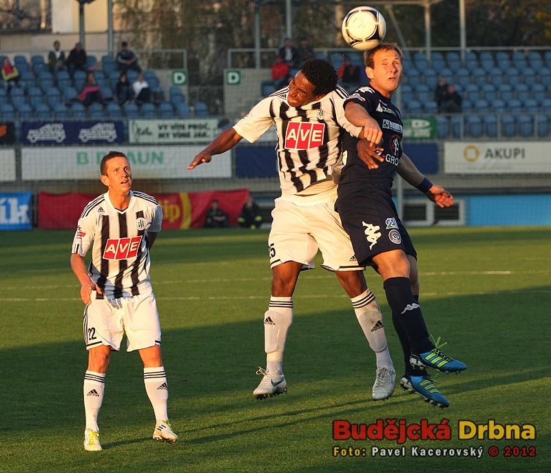 Brazilec Sandro v hlavičkovém souboji s Jiřím Valentou, vlevo navrátilec do domácí sestavy Petr Benát