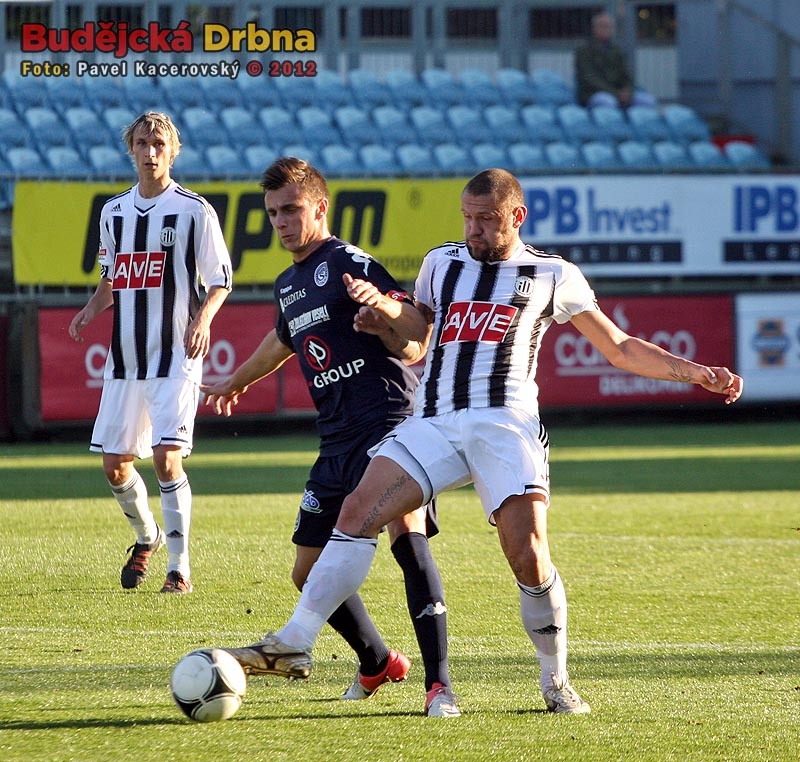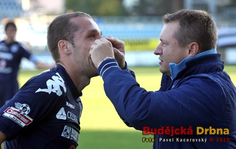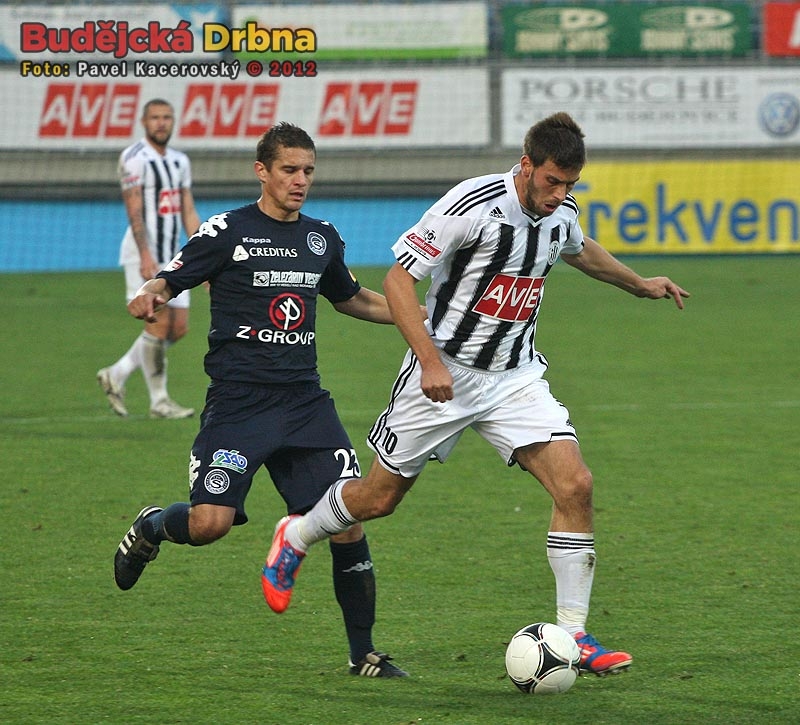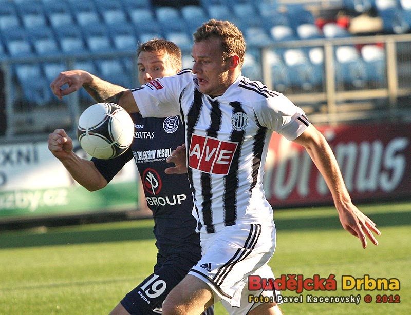 Stoper Dynama Jan Halama odehrává míč před Mariánem Kovářem