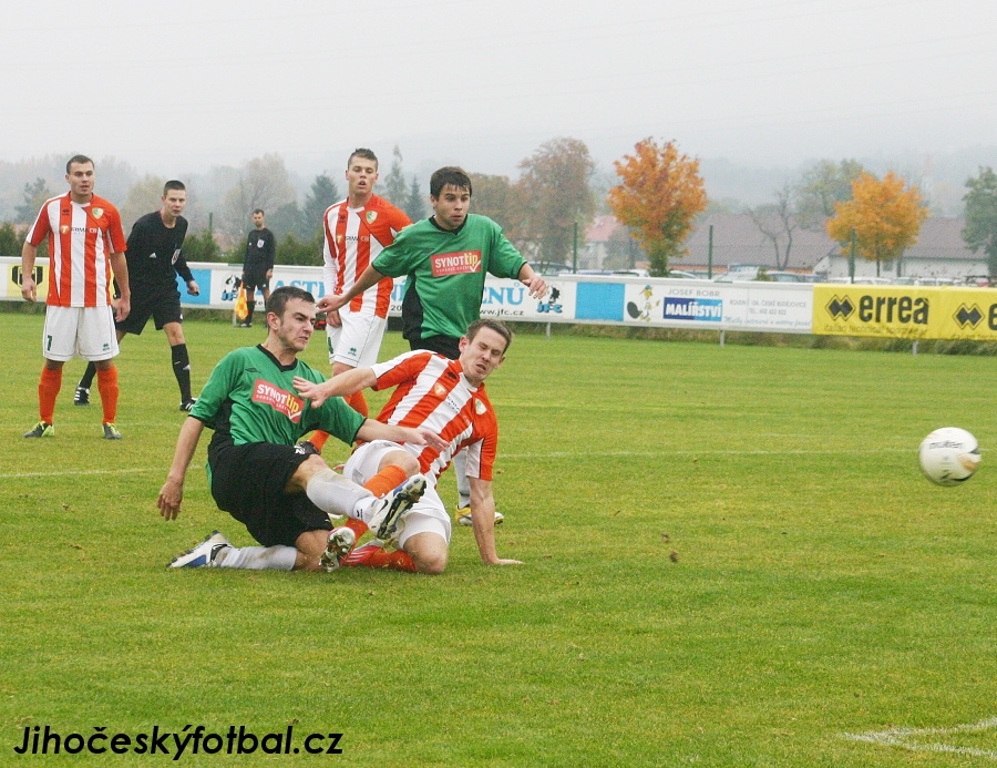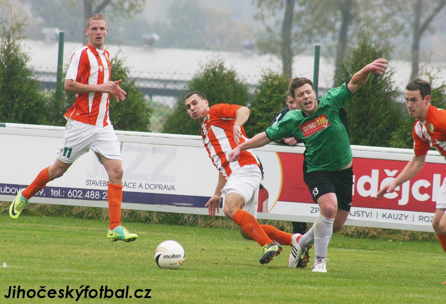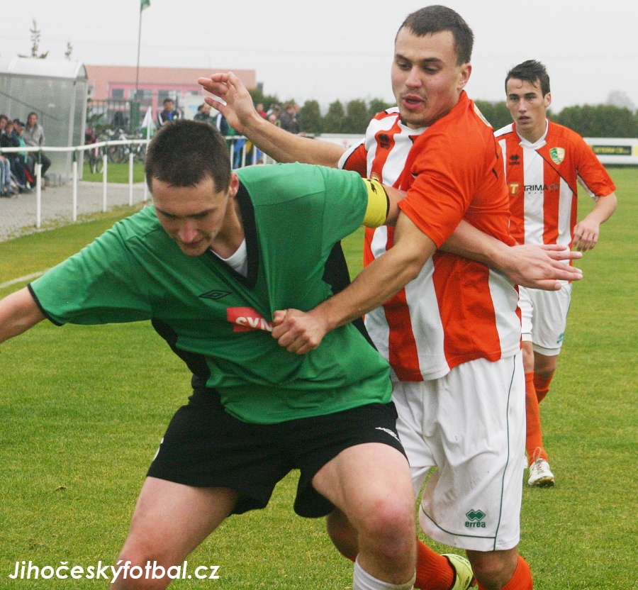 Saša Fedorkiv se snaží zastavit rokycanského kapitána Jana Hereita. Vzadu přihlíží střelec jediné branky Daniel Lerch