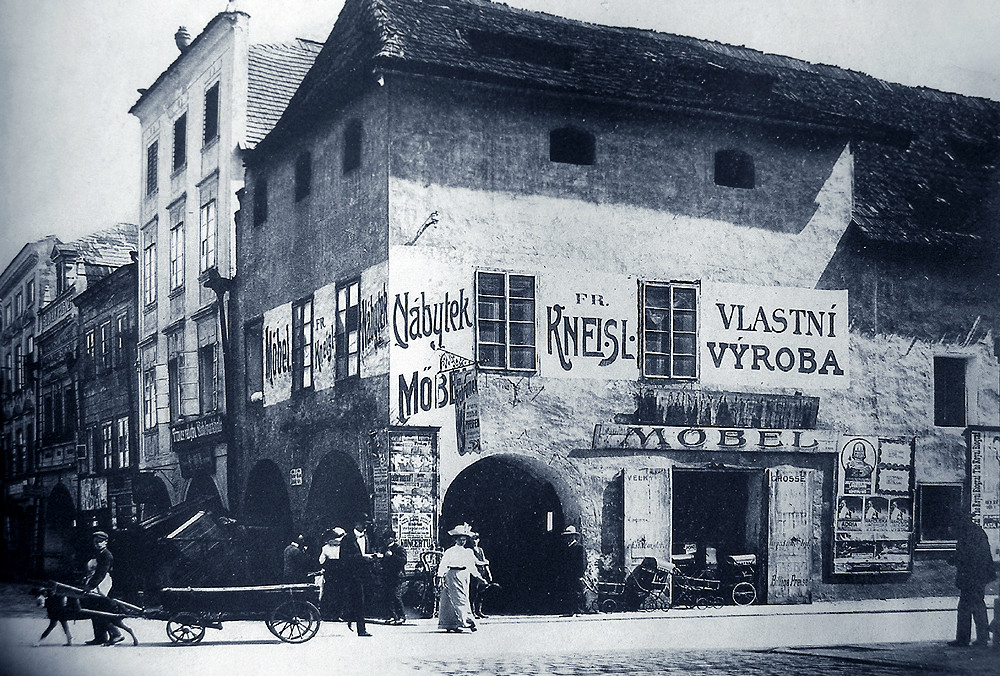 Obchod nábytkem Františka Kneisla na rohu Kanovnické a Kněžské za c. k.