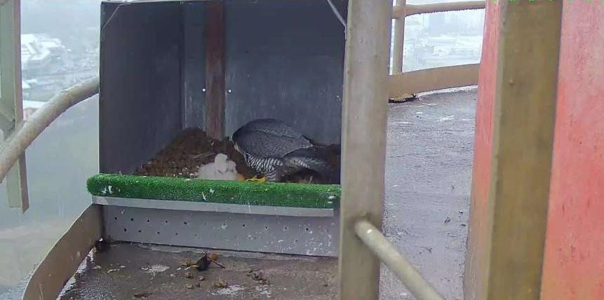 Sokolí pár vyvedl další tři mláďata. Na vráteckém komíně teplárny ohrožení dravci zdomácněli.