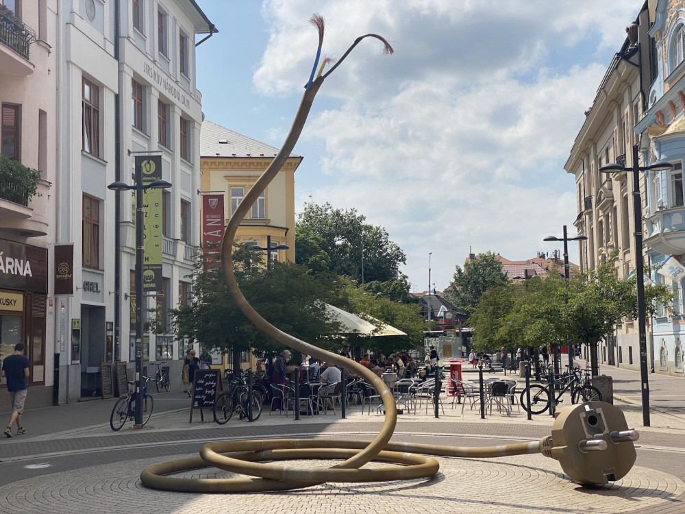 Zástrčka na Lannovce je alegorií dnešní doby. Sochu vytvořil Milan Cais