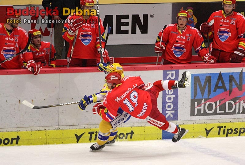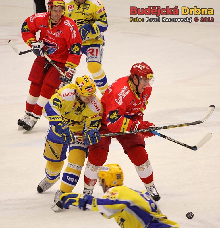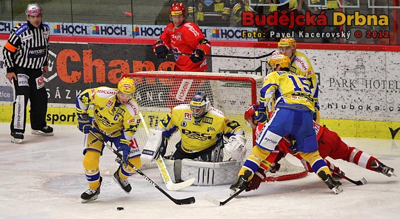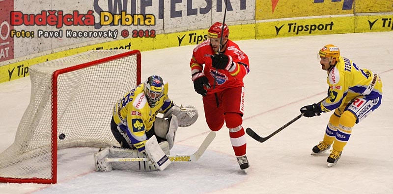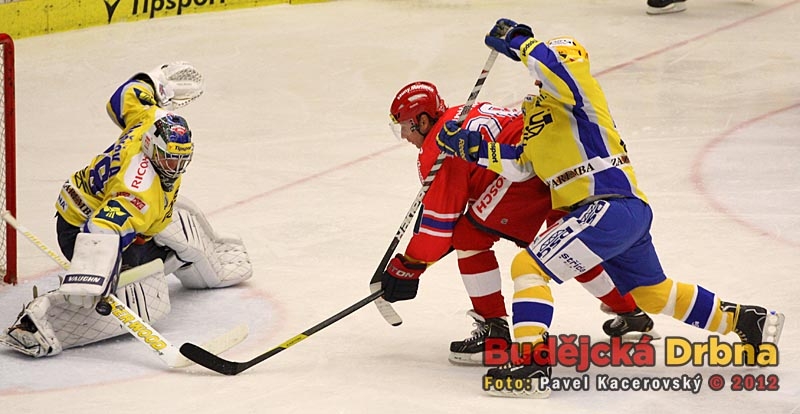 Puk letící z hokejky Milana Michálka, jehož v tento moment brání Bedřich Köhler, zkrotil pod svojí lapačkou Luboš Horčička